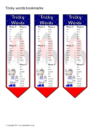 A set of printable bookmarks with various different themes listing tricky words by phase.