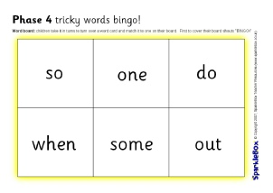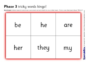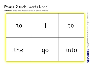 A set of bingo boards and cards featuring the six Phase Two tricky words in the DfES Letters and Sounds document.