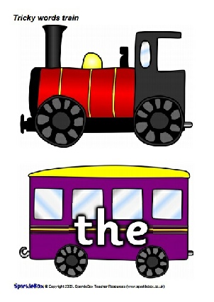 The 41 tricky words as specified in the DfES ‘Letters and Sounds’ publication, presented on coloured train carriages, with steam engine.