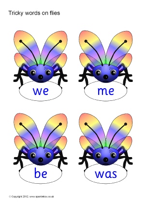 A set of tricky words presented on cartoon flies. Ideal for creating a fly swat game where two children are given fly swats, the teacher calls out a word and the first child to swat the fly wins.