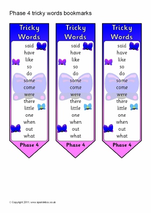 A set of printable bookmarks with various different themes listing Phase 4 tricky words.