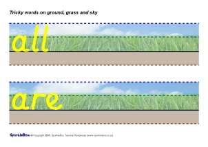 The tricky words as specified in the DfES ‘Letters and Sounds’ publication presented on ground, grass and sky writing lines.