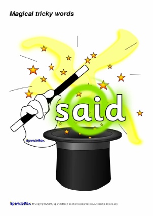 The 41 tricky words presented as specified in the DfES ‘Letters and Sounds’ publication, presented with magicians hats. Colour-coded for each phase.