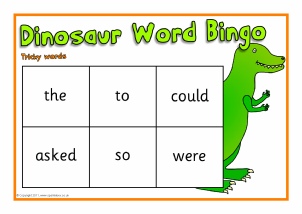 A set of dinosaur-themed bingo boards and word cards featuring tricky high-frequency words.