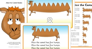 A set of A4 visual aids to accompany the number rhyme ‘Alice the camel...’.