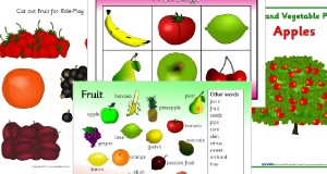 A set of simple printable sheets featuring images of fruit from the popular story for children to colour along with writing lines for writing.