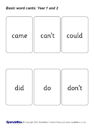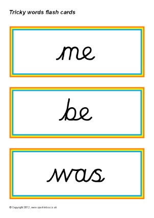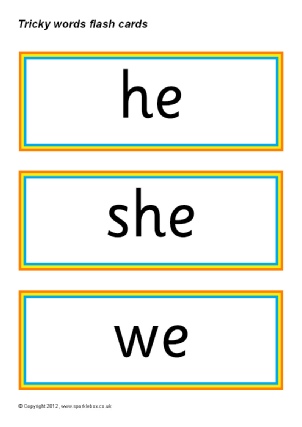 The tricky words (as specified in the DfES ‘Letters and Sounds’ publication) presented on cards with brightly-coloured borders.