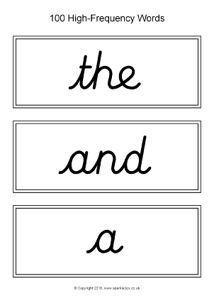 The 100 high-frequency words as specified in the DfES ‘Letters and Sounds’ publication, in cursive handwriting, presented on simple flash cards.