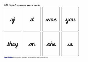 The first 100 high-frequency words in cursive script (as specified in the DfES ‘Letters and Sounds’ publication) presented on cards, 3 to a page.