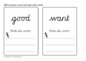 200 common words in cursive script on flash cards with lines for children to practise writing the words underneath.