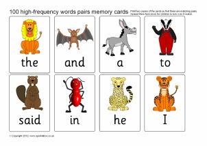 A set of 100 word and picture cards. Print out two copies and make into sets of pairs for memory games where children turn over the cards and match the pairs.