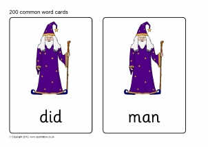 Flash cards featuring 200 common sight words alongside a wizard image.
