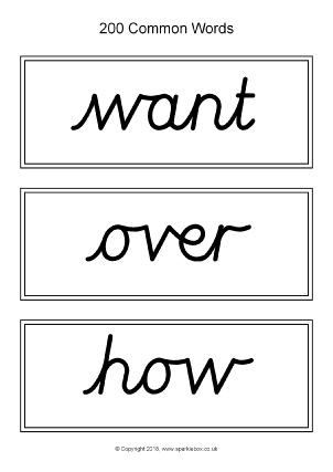The next 200 common words as specified in the DfES ‘Letters and Sounds’ publication presented in cursive script on simple flash cards.