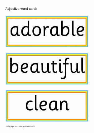 A large selection of adjectives presented on simple word cards with coloured borders.