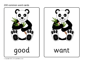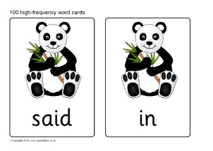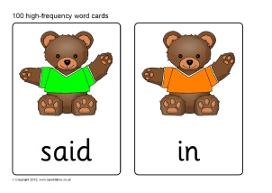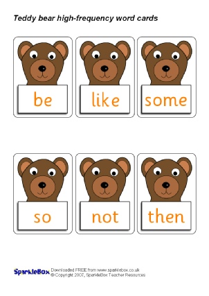 100 high-frequency words as outlined in the DfES ‘Letters and Sounds’ publication, presented on printable cards (6 to an A4 sheet) with a fun teddy bear character.