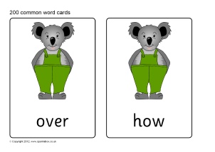 Flash cards featuring 200 common sight words alongside a cartoon koala character.