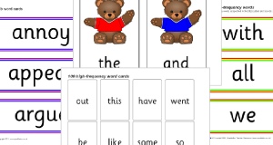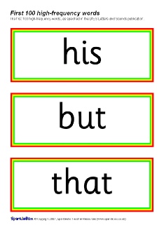 The first 100 high-frequency words (as specified in the DfES ‘Letters and Sounds’ publication) presented on cards with brightly-coloured borders.