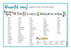 A simple word mat listing lots of useful nouns including everyday objects, people, places, food, clothes and vehicles.