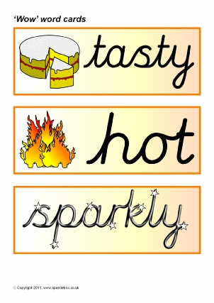 A set of printable cards (3-per-page) featuring some useful and interesting adjectives with accompanying pictures. In cursive script.