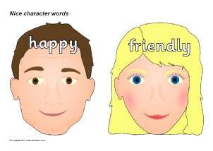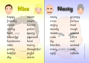 Printable nice and nasty faces featuring adjectives and adverbs to help children describe their characters and the way they talk.