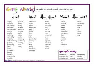A simple word mat listing lots of useful adverbs related to how, when, where, how often and how much.