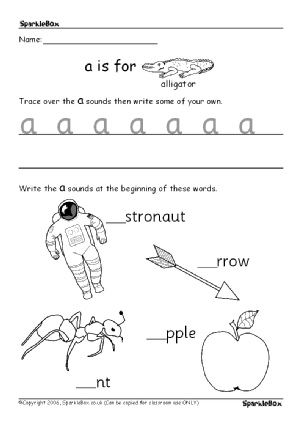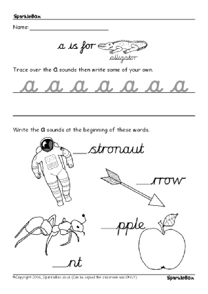 Very simple worksheets to help children practise the formation of alphabet sounds. This set includes worksheets for sounds a-j.