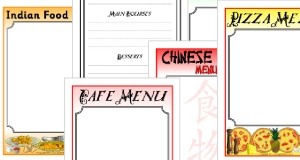 A set of simple generic menu writing frames suitable for a variety of contexts. Includes templates for drinks, starters, mains, desserts, snacks, children’s menu and more.