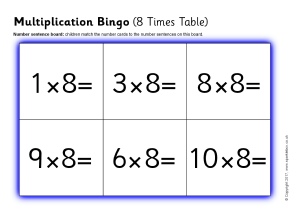 A set of printable bingo boards and number cards with multiplication number sentences from the 8 times table.
