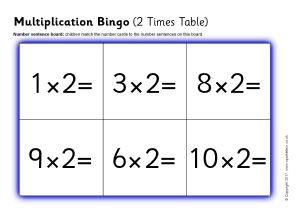 A set of printable bingo boards and number cards with multiplication number sentences from the 2 times table.