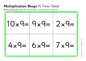 A set of printable bingo boards and number cards with multiplication number sentences from the 9 times table.