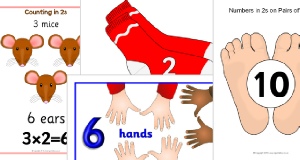 A set of simple worksheets where children count the items and complete 2 times table number sentences.