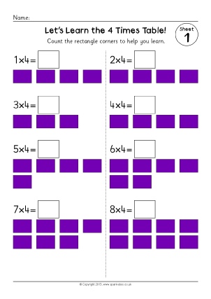 A set of simple worksheets where children count the corners and complete 4 times table number sentences.