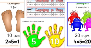 Posters featuring pictorial representation of repeated addition/arrays for numbers in multiples of 5 from 20 to 50.