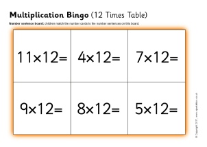 A set of printable bingo boards and number cards with multiplication number sentences from the 12 times table.