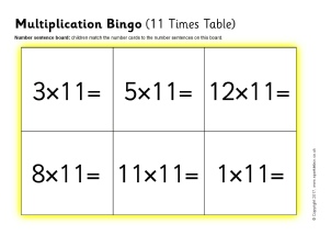 A set of printable bingo boards and number cards with multiplication number sentences from the 11 times table.