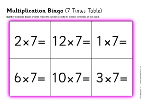A set of printable bingo boards and number cards with multiplication number sentences from the 7 times table.