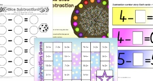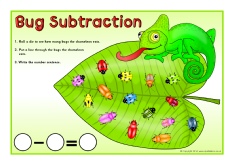 Printable desktop activity mats where children roll a die, cross out the bugs that the chameleon eats and then write the number sentence.