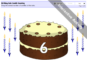 A simple click-and-drag activity ideal for whole-class teaching and using an interactive whiteboard. Children drag the appropriate number of candles to the cake.
