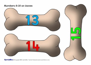The numbers from 0-30 presented on bones. Great for use in your sand or digging area linked to a topic on dinosaurs or the ‘Funnybones’ books.