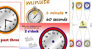 A printable desktop mat with vocabulary and accompanying images related to time.