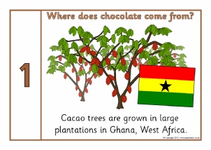 A set of posters showing the process of making chocolate from cacao tree plantations to the factory.
