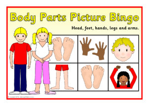 A set of printable bingo picture boards and cards featuring the parts of the body: head, feet, hands, legs and arms