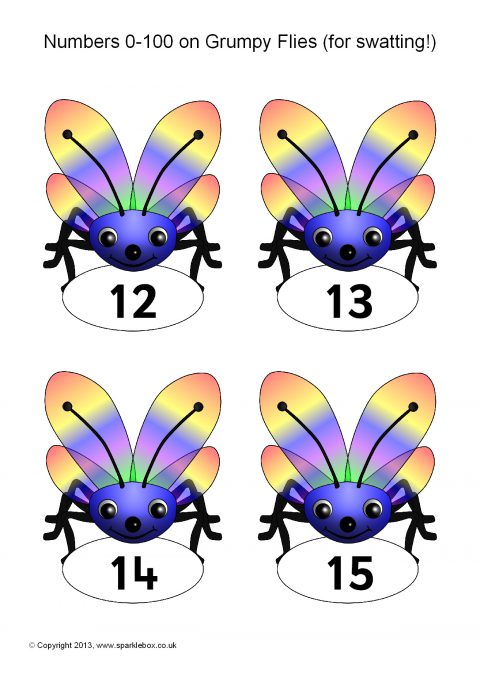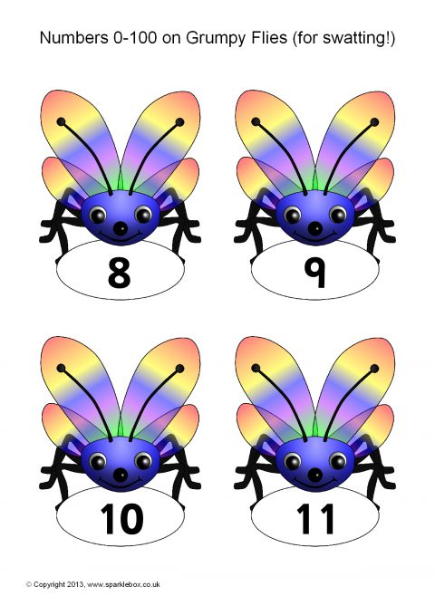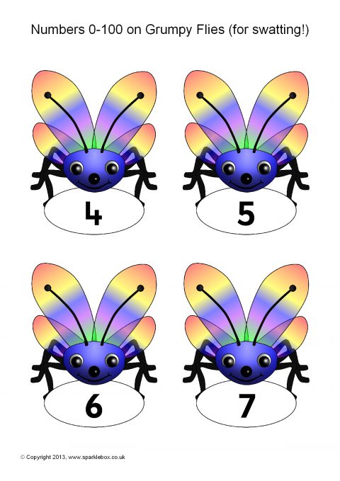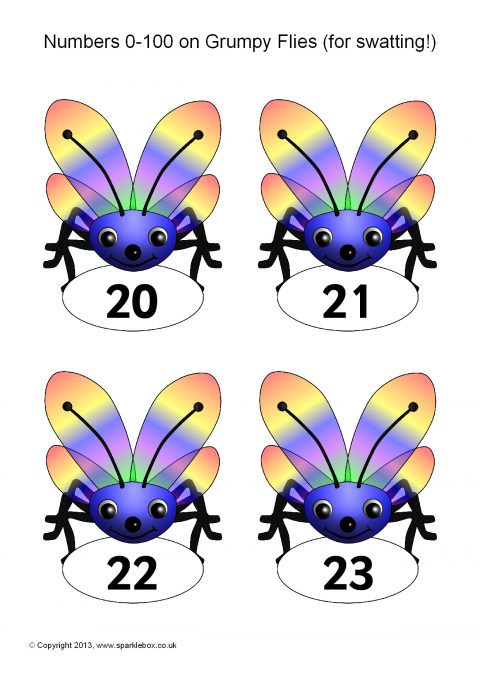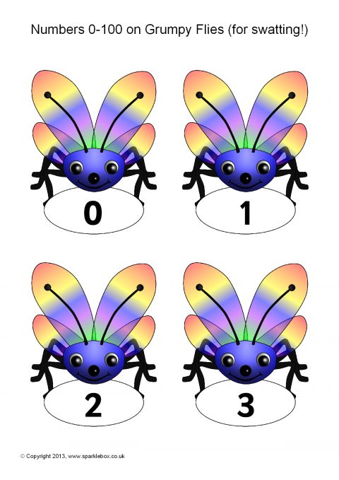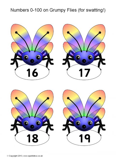 The numbers from 0 to 100 presented on fly characters. Includes ‘grumpy’ flies for you to create a number recognition ‘fly swatting’ activity.
