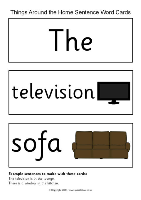 A set of printable word cards that can be used to make sentences about objects around the home.  Such as ‘The television is in the lounge’ or ‘There is a window in the kitchen.’