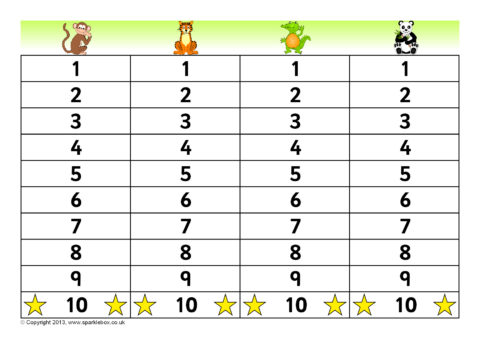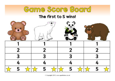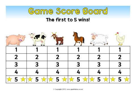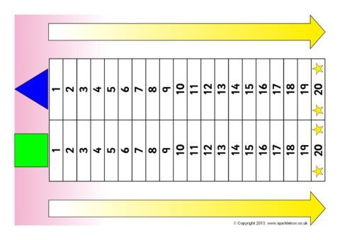 Simple printable score boards for use in all sorts of classroom games.  Using counters, children make their way to the finish square.  Includes boards for up to 6 players.