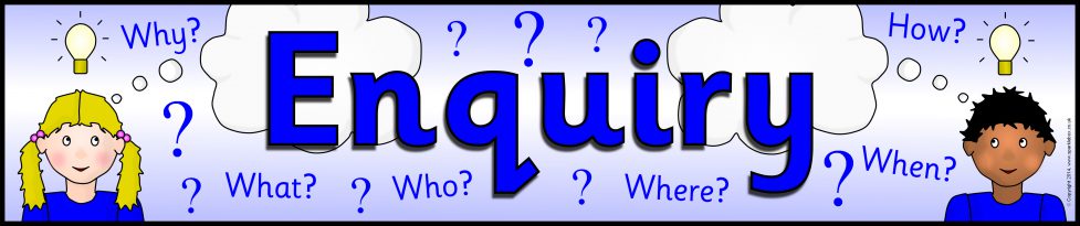 A printable banner with the title, ‘Enquiry’. Themed with question words and question marks.