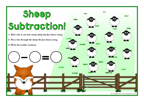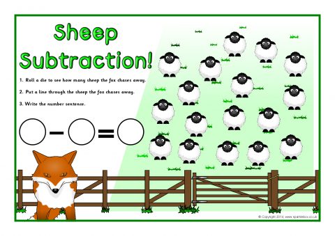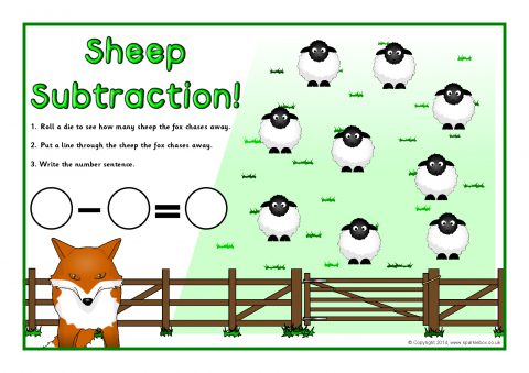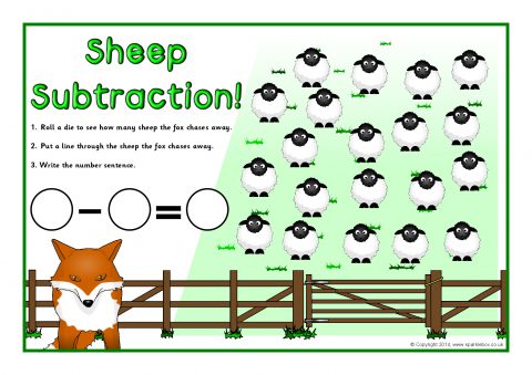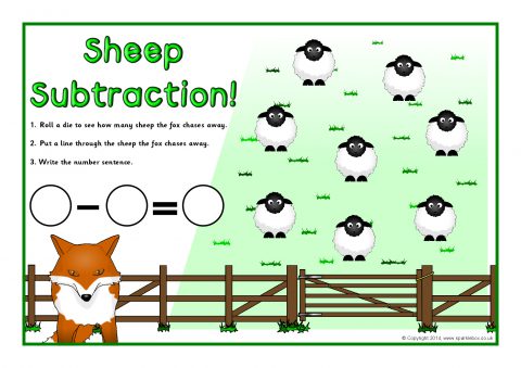 Printable desktop activity mats where children roll a die, cross out the sheep the fox chases away and write the number sentence.