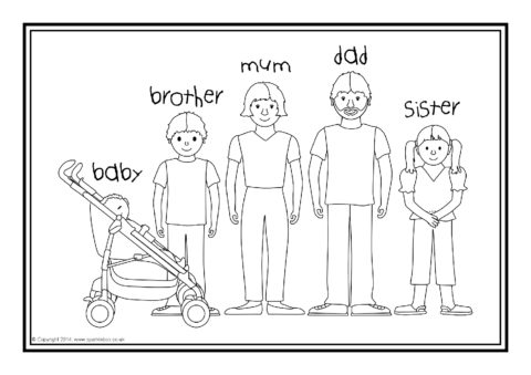 A set of simple colouring pages with images of various families with simple terms for children with English as a second language.