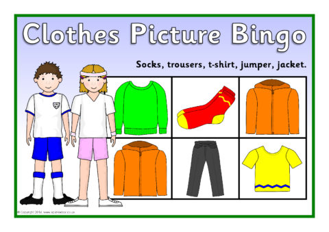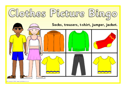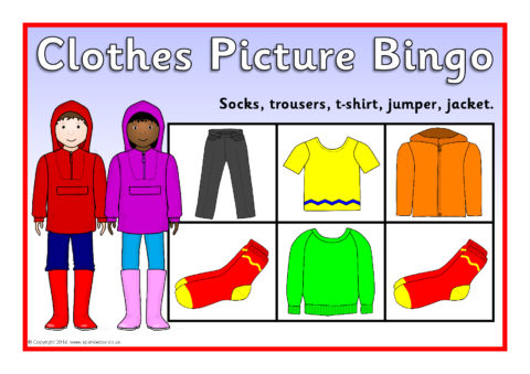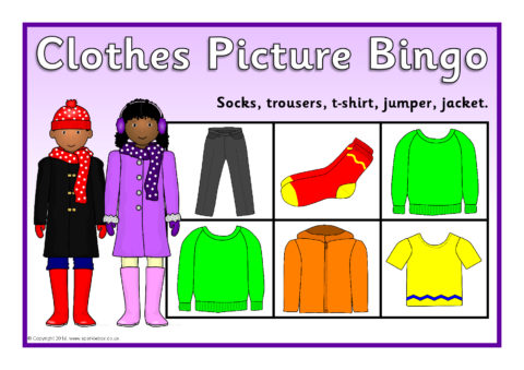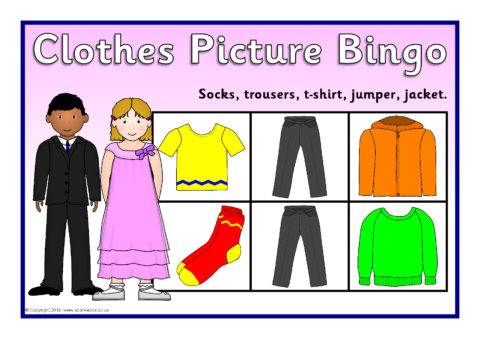 A set of printable bingo picture boards and cards featuring a selection of clothes: socks, trousers, t-shirt, jumper and jacket. Great for use with ESL children.