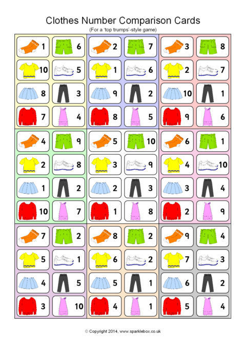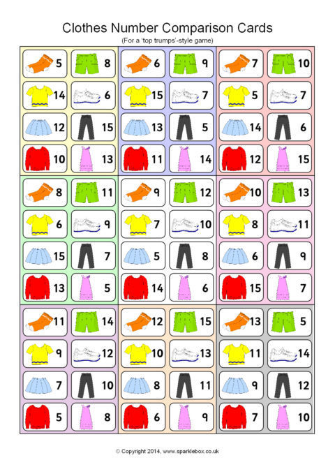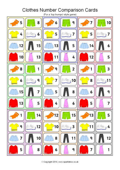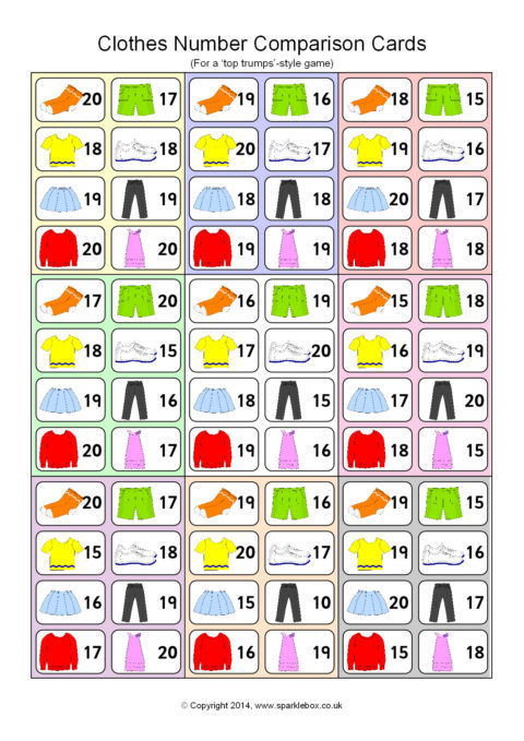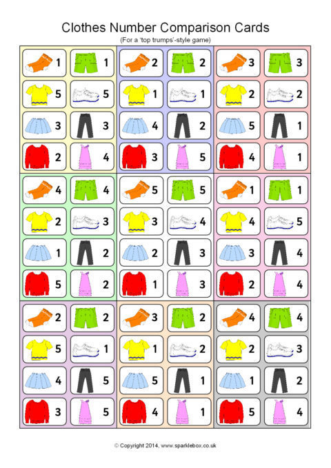 A great set of 45 cards (9 per A4 page) for use in a ‘Top Trumps’-style game. Children each have a hand of cards and take turns to compare an item of clothing and its number. The child with the highest number keeps the cards in each round.